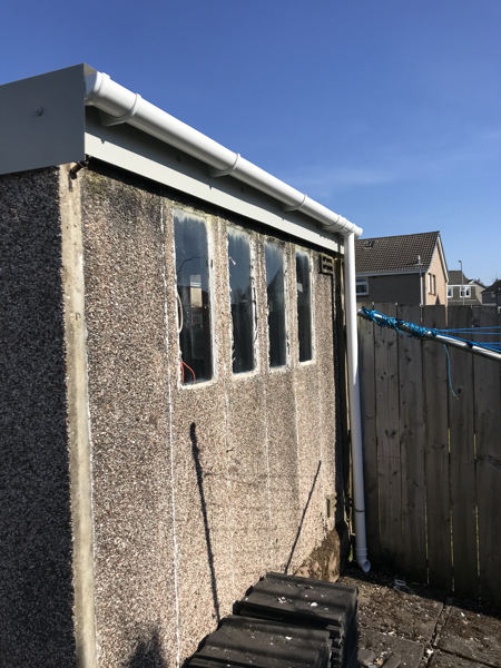 The new garage roof below is made from galvanised steel roof sheets coated with Plastisol. These high tech roof sheets have a felt underlay which helps reduce condensation and provides an attractive internal finish. We also fitted steel Plastisol facias.